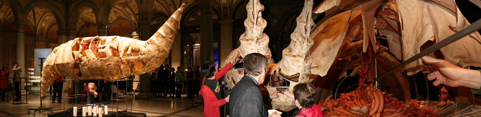 A four-meter long and two and a half meter tall abstract animal stands in the neo-Renaissance Columned Main Hall of Vienna’s Museum for Applied Art. “Knack” has crusty skin made of baked bread dough and its innards are made of 100 kilograms of frankfurter sausage. After a concert by Vienna’s Vegetable Orchestra, 300 guests start to slaughter “Knack”. They tear its skin to pieces and with them wrap its guts. They eat him.